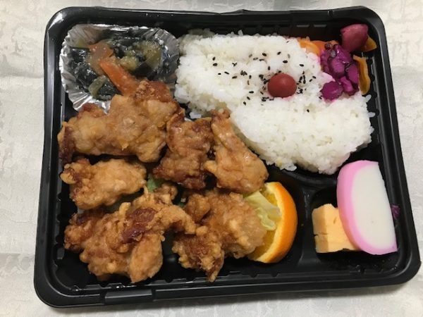 からあげ弁当を作っていただきました。唐揚げが6個・お惣菜・果物まで入ったボリュ―ミーなお弁当でした。手作りの唐揚げはジューシーで、お惣菜もごはんがすすむ美味しさでしたよ。