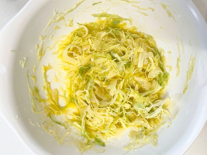 2.  1にキャベツを入れ、卵とよく混ぜ合わせてから片栗粉を入れます。