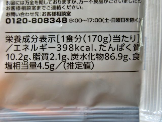 麺の栄養素は炭水化物が中心となります。そのため、エネルギーは398カロリーで炭水化物が86.9gと高めです。しかしながら、たんぱく質が10.2gも入っている点はうれしいポイント。価格は税込128円で、一袋に麺が140g入っています。