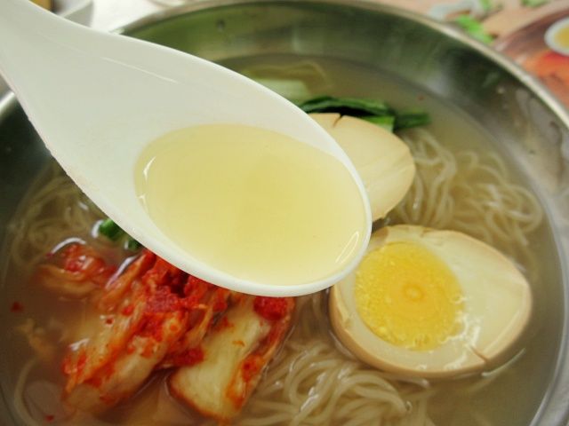 透明度の高い透き通ったスープ。日本にはないような独特な香辛料の匂いを感じます。一口飲んでみると、フルーティーでまろやかな甘さが広がっていく。そして、あとから酸味がやってきて味全体を引き締めてくれます。さっぱりとした口あたりで、飲みやすいスープです。そこへトッピングのキムチが加わると、ピリッとした辛さがスープに溶け出し、味に深みを与えてくれました。酸味と辛味の絶妙なバランス感覚がたまりません。