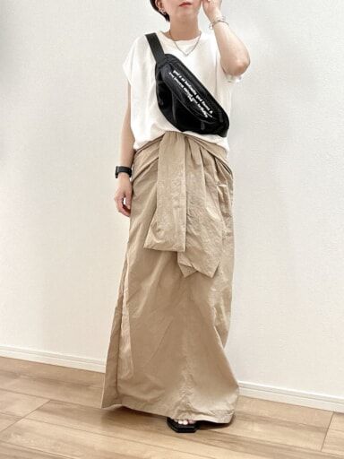 機能性や動きやすさを兼ね備えつつ、ベージュのロング丈スカートなら、女らしさもたっぷり。トップスは、Tシャツのような楽ちんな着心地ながらも、品良くキマるので、女らしさを損なわずに合わせられます。ウエストにデザイン性のあるボトムとも好相性なトップスです。