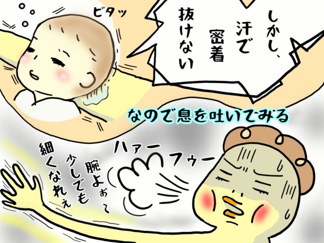 腕の中で眠ったチビ太くんを布団におろすと動き出してしまい、起こしてなるものかとなんとか再び寝かせようと体を密着させ、手を握ってジッと固まるてる子さん。密着の体勢が辛くなってきても、寝かせるためならと体勢をキープしたまま耐えること数十分・・・チビ太くんをチラッと見てみると・・・。