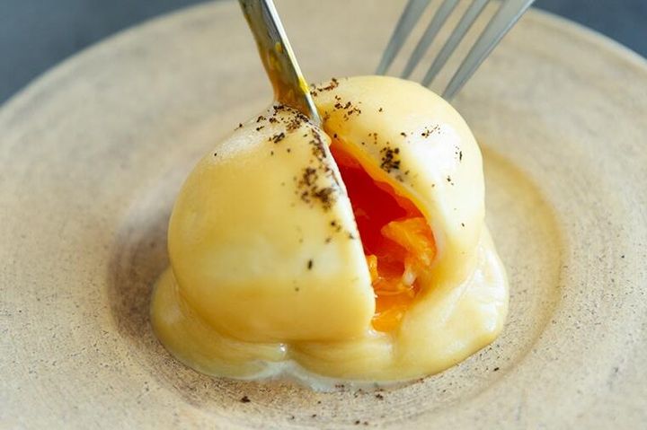 マヨネーズに白味噌を加え、まろやかなソースに。半熟の卵黄とソースの濃厚な味をスパークリングワインが切ってくれる。