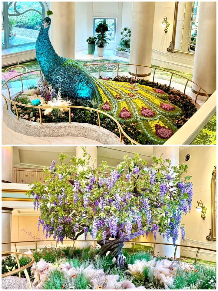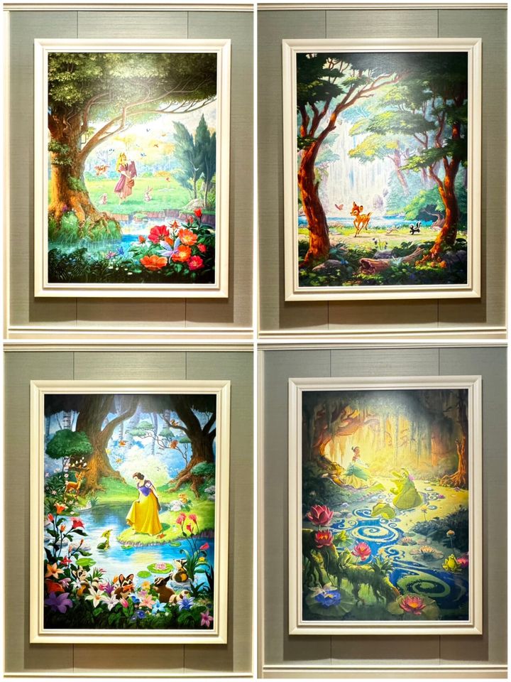 ▲客室廊下に飾られているディズニープリンセスなどの絵画や、客室に向かう途中の吹き抜けエリア「コンサバトリー」にあるクジャクを模したデコレーションや、ディズニー映画「プリンセスと魔法のキス」の茂みをモチーフとした藤の木を模したデコレーションは、宿泊した記念の写真スポットにピッタリ