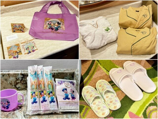 ▲ルームアメニティは、ファンタジーシャトーオリジナルデザインの全2種類のポストカードや、藤の花の紫を基調としたエコバッグやコップなどを用意。ルームウェアは襟元に蝶モチーフがデザインされ、ルームスリッパもオリジナルのデザインとなっています。