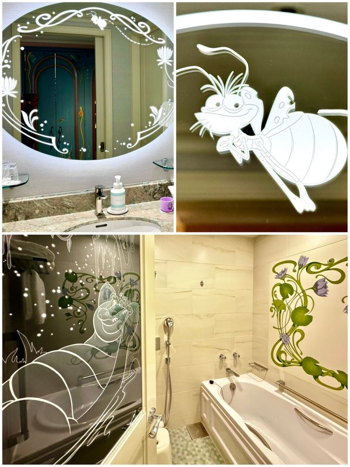 ▲バスルームの扉やパウダールームの鏡には、ディズニー映画「プリンセスと魔法のキス」に登場するホタルのレイやワニのルイスが描かれており、バス、トレイ別、バスルームも洗い場とバスタブが別になっているのも嬉しいポイントです