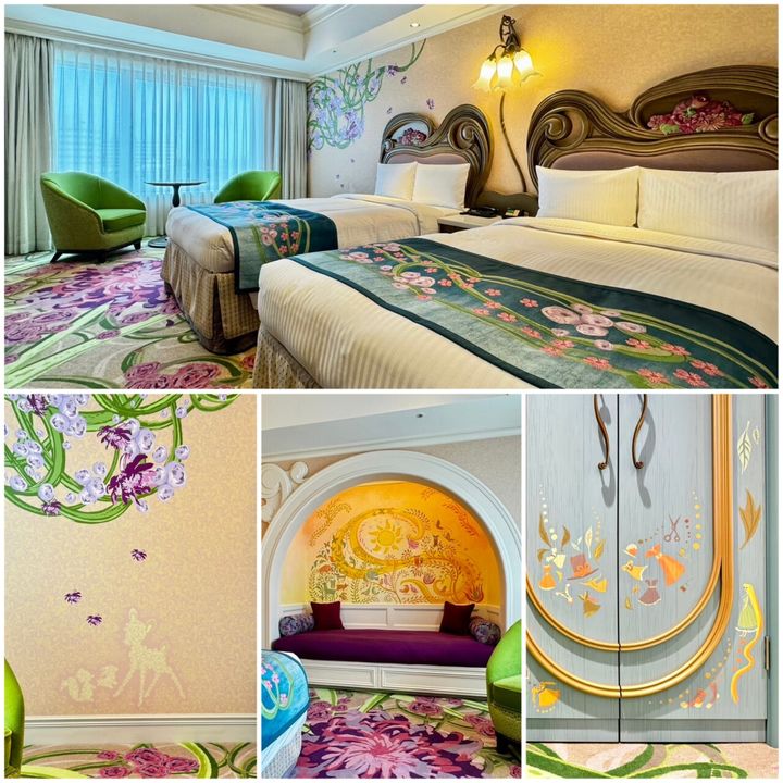 ▲ファンタジーシャトーで最も客室数が多い「スーペリア・アルコーヴルーム」には、壁のくぼみを利用したアルコーヴベッドやドレッサーには「ラプンツェル」、壁紙には「バンビ」など、いたるところにディズニー映画のキャラクターや草花をモチーフにした装飾が施されています