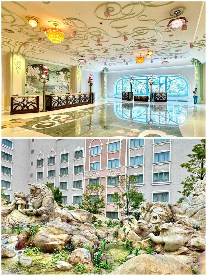 ▲「東京ディズニーシー・ファンタジースプリングスホテル」の外観。グランドシャトー側の外観(上画像)、ファンタジーシャトー側の外観(下画像)。ファンタジーシャトー側の大きな楕円の窓の前には、ディズニー映画「ファンタジア」に登場する、魔法使いの弟子のコスチュームを身にまとったミッキーマウスが岩で表現された魔法の泉が!