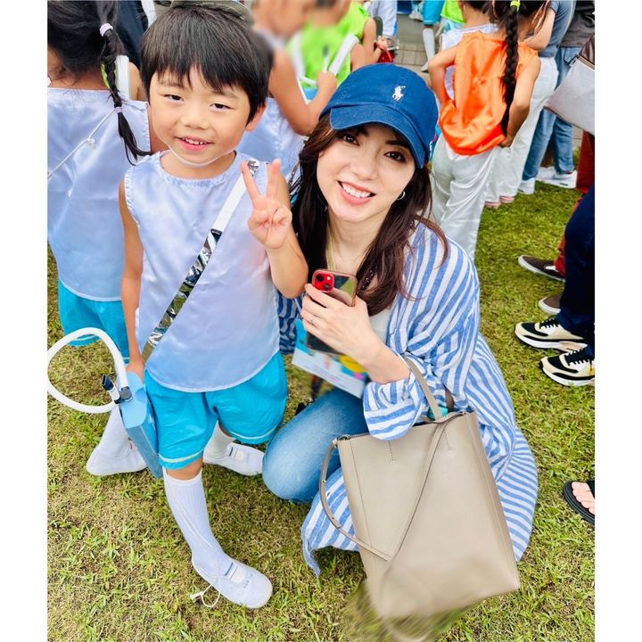 「親子競技があると聞いていたので、動きやすい&砂汚れが気にならないデニムを選びました。普段あまりデニムを穿かずキレイめコーデが好きなので、ブラウスを合わせていつもの自分らしく着こなしました。うちの園は運動会を5月と9月の2回開催します。9月のほうが組体操やマーチングバンドもあって本格的です。園庭で実施するのですが、親はずっと立ち見になるので周りの邪魔になる日傘はNG。なので、帽子と塗り直し用の日焼け止めスプレーはマストです。腕はちゃんと対策していたのですが、デニムとスニーカーのすき間のことを失念していて!そこだけ日焼けしてしまったので薄手の靴下を仕込むようにして日焼け対策をしておけばよかったなと後悔しました」園田里奈さん・37歳(9歳と6歳と5歳の男の子ママ)