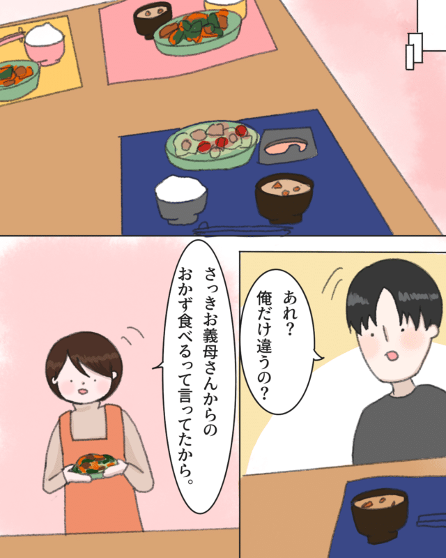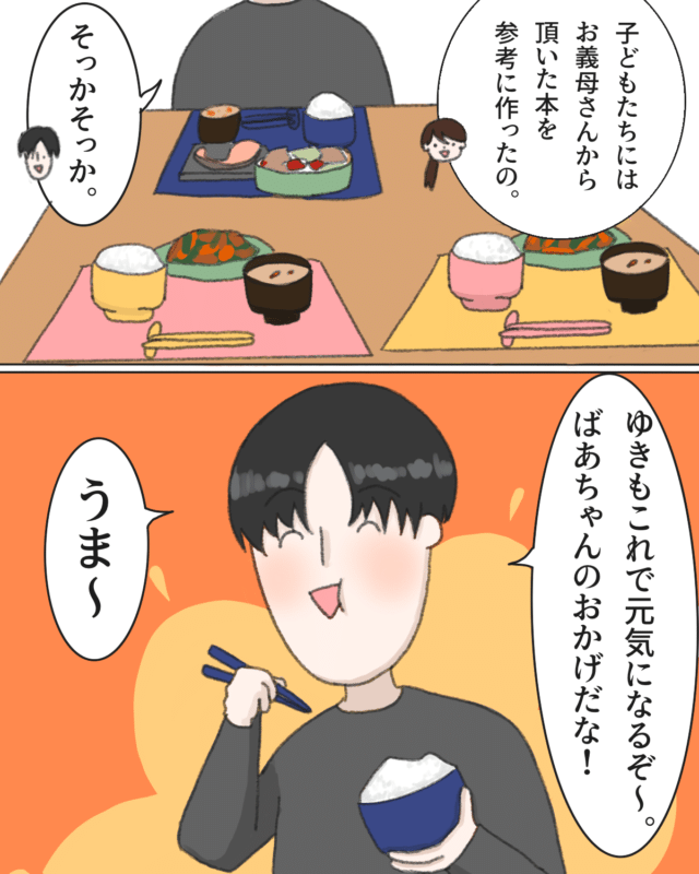 夕食の後片づけをしていて「体が弱いのはそちらの家系?」と義母に言われたあゆみさん、即否定したものの「じゃ、やっぱりあゆみさんの手料理かしら?」と言われモヤモヤ・・それから数日後のこと、突然大量の料理本とお惣菜が送られてきて「母親の務めだから参考にして!」と言われ、またしてもモヤモヤが・・