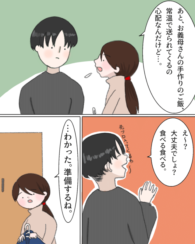「あと、お義母さんの手作りのご飯、常温で送られてくるの心配なんだけど・・」