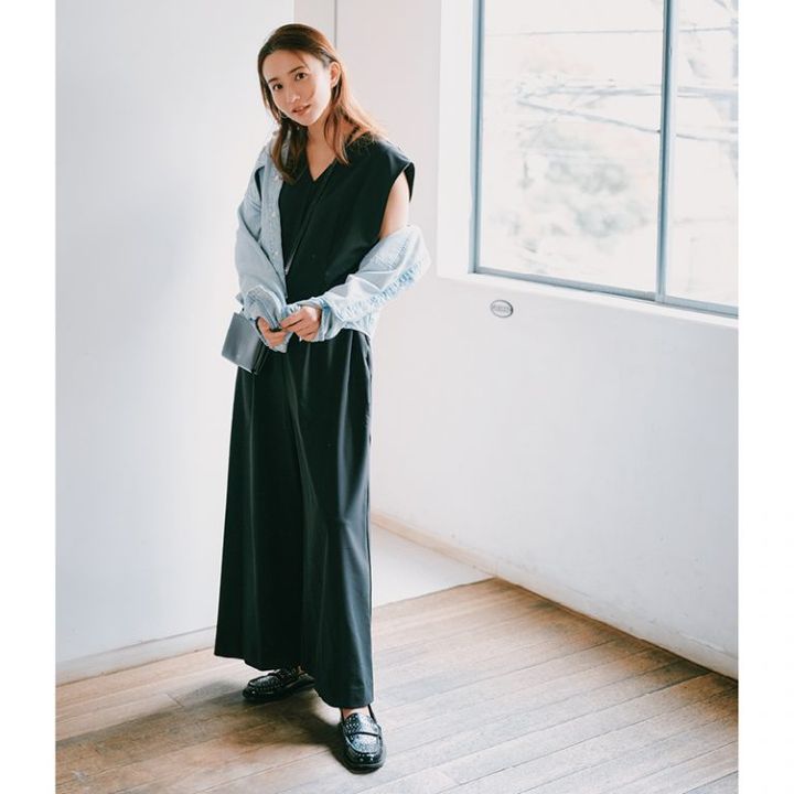 きちんと感のある黒オールインワンは カジュアルなGジャンで抜け感を。 足元はローファーでキレイめに