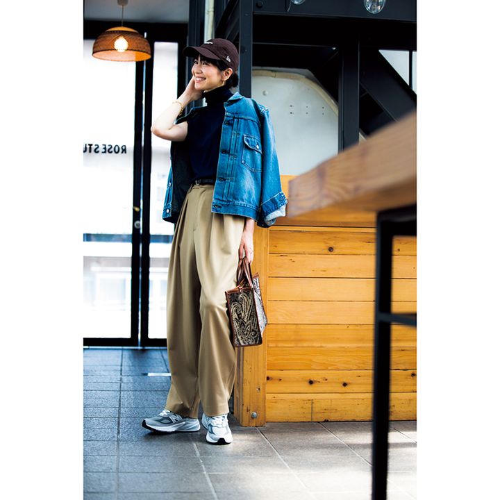 ゆるパンツ×スニーカーの 大人カジュアルに 肩掛けGジャンでこなれ感を