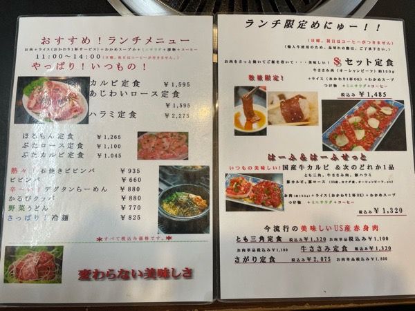席に案内されメニューを見ると・・・これまた豊富な種類に嬉しい悲鳴。何を頼むか悩みに悩んで、定番の「カルビ定食」と、「はーふ&はーふせっと」を注文。