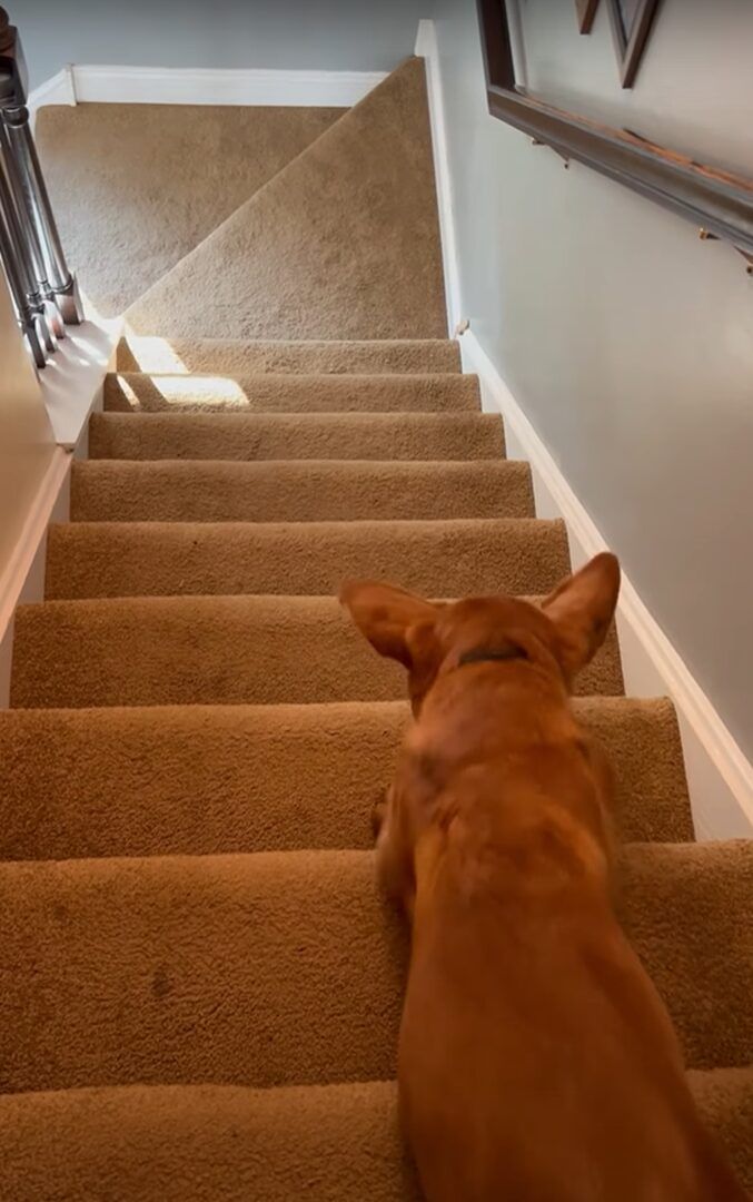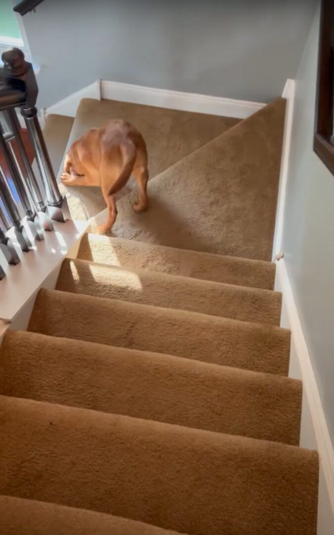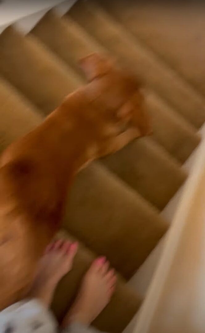 飼い主さんと一緒に階段をくだるラブラドール。 ところが、この子はその階段を歩いてくだっていくつもりはないようです!!