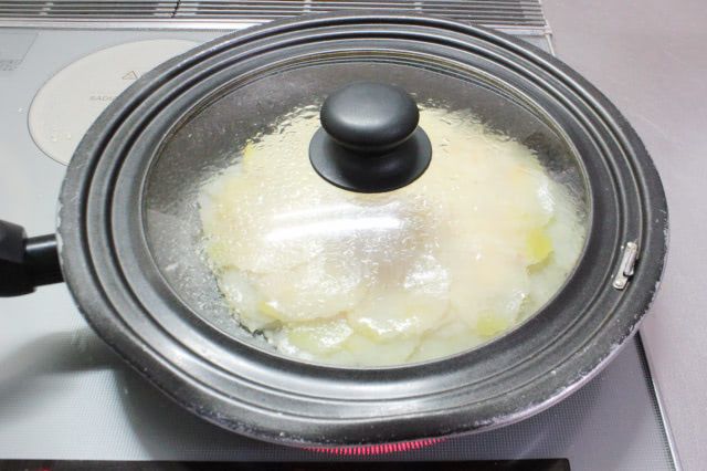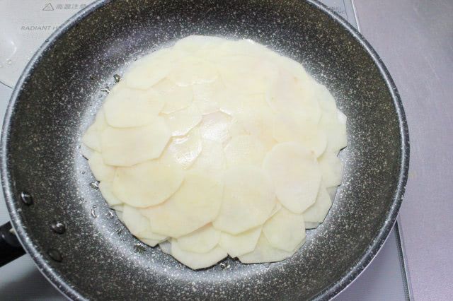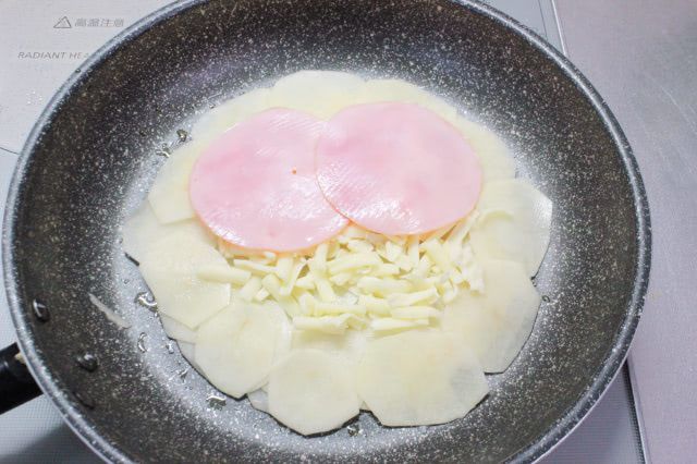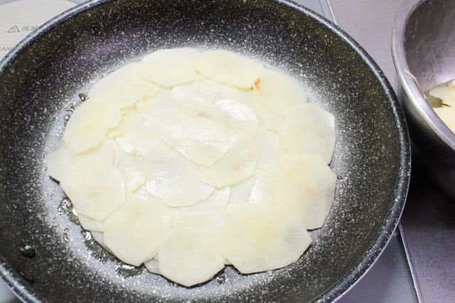 隙間が出来ないように並べるのがポイントです。中央にチーズとハムを乗せるので、外側を分厚く並べるとバランスが取れるそう。今回は直径約20cmのフライパンに、じゃがいもを並べました。