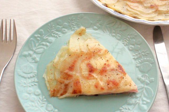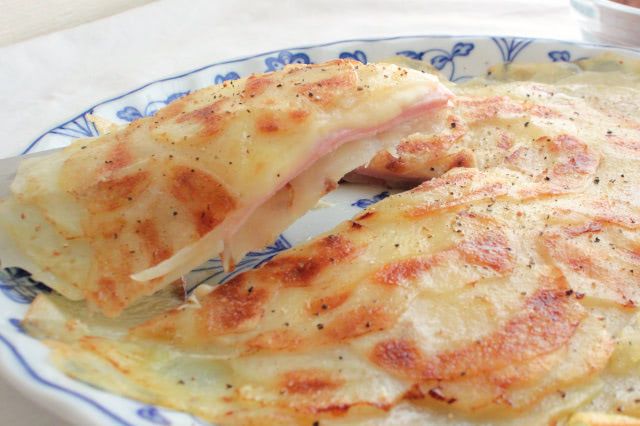 ひと切れカットしてみると、上下の薄いじゃがいもの間にチーズとハムが見えますよ。ちなみに厚さは約1cm。じゃがいもを5個も使ったのにとても薄い仕上がりです。