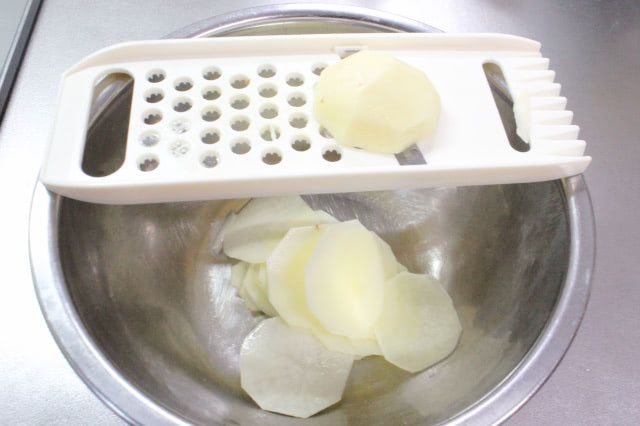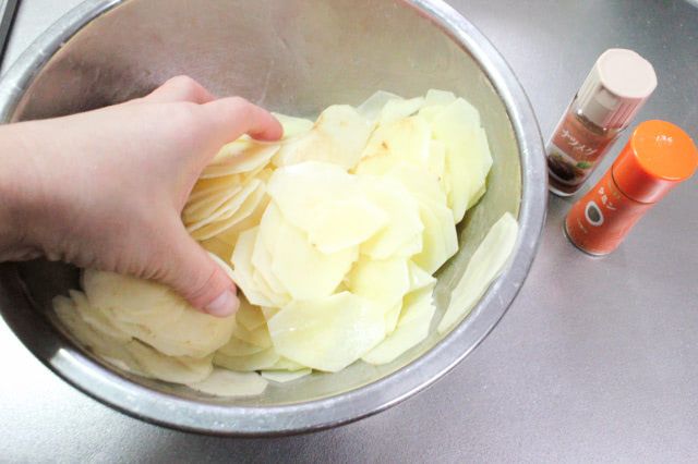 1.じゃがいもの皮を剥いてスライサーで薄切りにし、塩、ナツメグ、クミンを加えて和えます。