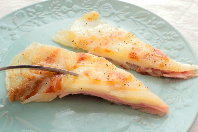 ハム、チーズ、じゃがいもと食べ慣れている味の組み合わせですが、クミンとナツメグの風味が広がるので、おしゃれな印象。今回は何度もひっくり返して焼けなかったので、表面にカリッとした食感は付きませんでしたが、手の込んだスイーツのような美しさと、繊細な食感のガレットを堪能出来ました。