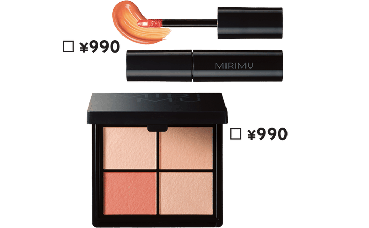 【ミリム▶ALL990円で65品をラインナップ】“すべての人の魅力を引き出すブランド”がコンセプト。上から:しっとり質感! ミリム モイストティント アプリコットベージュ、チークにもOK。同 マルチアイシャドウパレット アプリコットピーチ 各¥990(共にNuzzle)