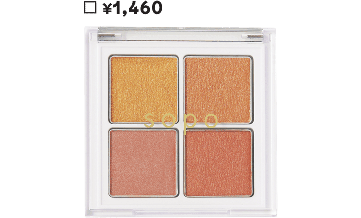 【sopo▶アーティストが生み出した旬シェード】朝の日差しを思わせるゴールドとオレンジ、ニュートラルピンクの組み合わせが、ヘルシーな色気を醸し出す。透け感があって軽やかだから、どう重ねても旬なムードに! sopo アイパレット 08 ¥1,460(ノイン)