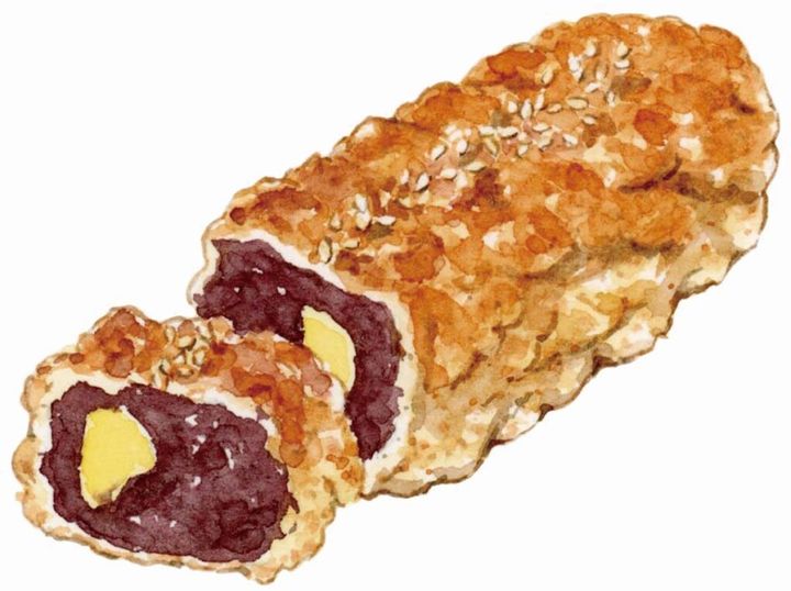大正10(1921)年から続く和菓子店が、万葉集に詠われた大樹「むろの木」にちなんで作った棹物の焼き菓子。甘さが上品な十勝産小豆「雅」を炊き、刻み栗や洋酒漬けのレーズン、オレンジピールなどを混ぜたつぶ餡を、木肌を模したアーモンド粉のそぼろで包んで焼き上げている。そぼろには白ゴマも散らしてある。「餡の組み合わせが新鮮でした。しっとりとまとまっていて、外側のそぼろの食感とのバランスもよく、この形だからこそのおいしさを感じます」(高)。賞味期限は常温保存で30日。1本¥1,458。注文は電話、FAXから。広島県福山市沖野上町4‒15‒27 FAX084‒923‒4890 8:30~18:00 無休