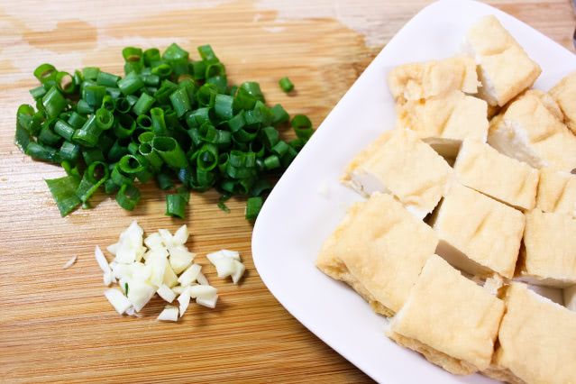 1. 青ねぎを小口切りに、にんにくをみじん切りに、厚揚げを食べやすい大きさに切ります。