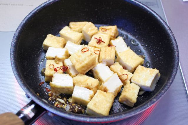 3. 厚揚げを入れて全体にオリーブオイルが絡まるように炒め、輪切り唐辛子を加えます。