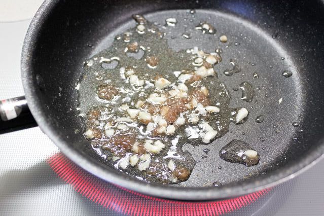 2. フライパンににんにく、アンチョビ、オリーブオイルを入れて弱火にかけ、にんにくが色づくまで炒めます。