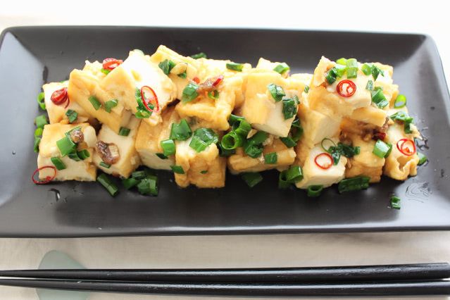 輪切り唐辛子の赤、青ねぎの緑、厚揚げの白がイタリアの国旗のような色合いですね。