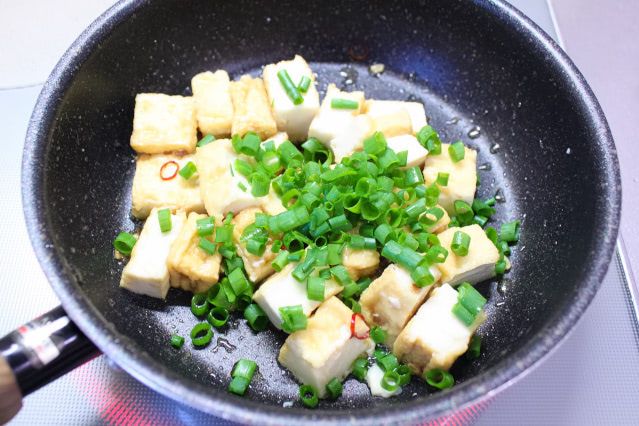 4. 厚揚げが温まったら、青ねぎを加えます。