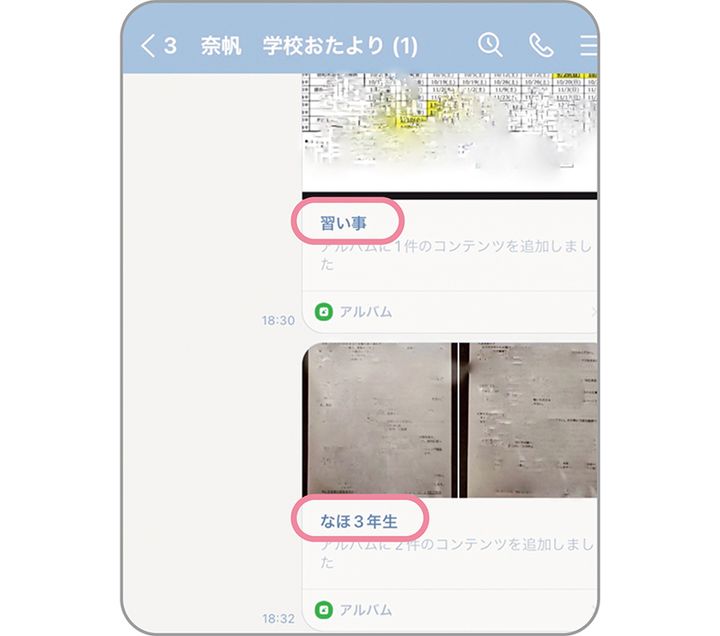 外出先でも確認したい&夫にも把握してもらいたいプリントはLINEで管理。夫とのグループラインを子どもごとに作成して、アルバムに保存しています。その他は子どもごとクリアポケットファイルに。デジタルとアナログ、それぞれ良さがあるので良いとこどりしてます!