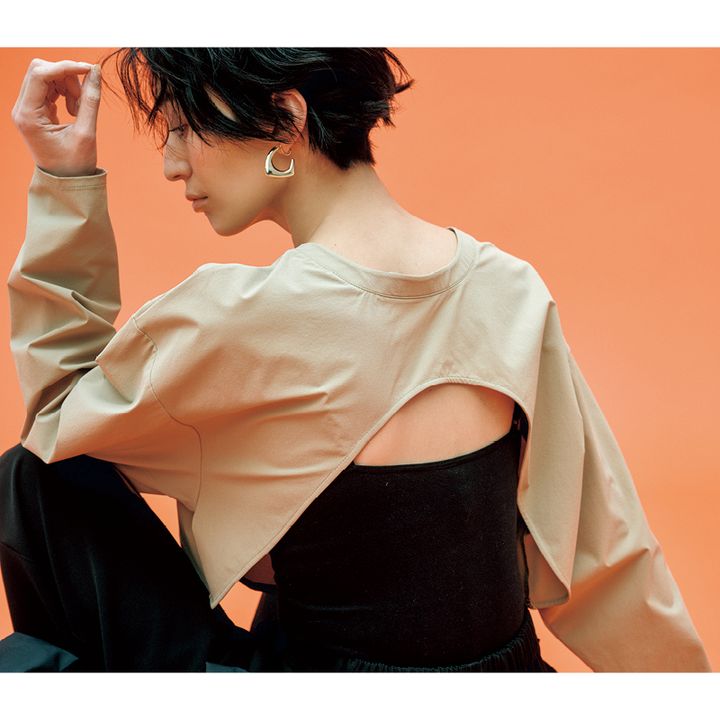 UVカットトップス¥16,500 バッグ¥13,200 パンツ¥24,200(すべてstyling//スタイリング/ ルミネ新宿1店)イヤリング¥6,600(アビステ)