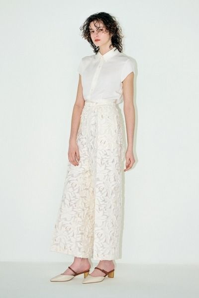 白ジャカードパンツ/ガリャルダガランテ(ガリャルダガランテ 青山店) パンツをはく際、特に気になってくるのは太もものハリ。のっぺりしないよう立体的なデザインをうまくとり入れて目線をそらし、スタイルアップを無理なく実現。同色の花柄がモザイク的な役割を果たして、体型カバーに効果を発揮。クラシックなジャカードなら花柄もシックに装える。