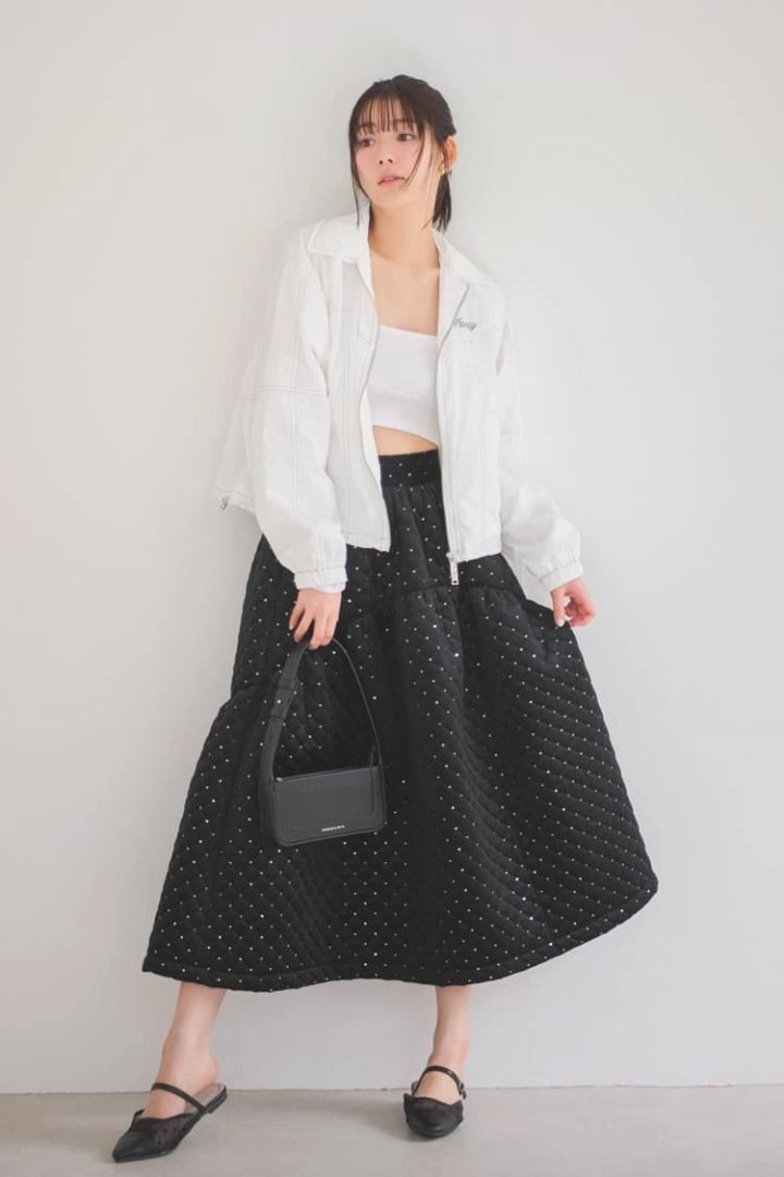 黒ビジューキルティングスカート 3,990円、ミュール 3,390円/ともに神戸レタス 白ナイロンジャケット 11,954円/ナスティーファンシークラブ(スクリーンショット) イヤリング 1,540円/アネモネ(サンポークリエイト) バッグ 9,900円/チャールズ&キース(チャールズ&キース ジャパン) インナー/スタイリスト私物