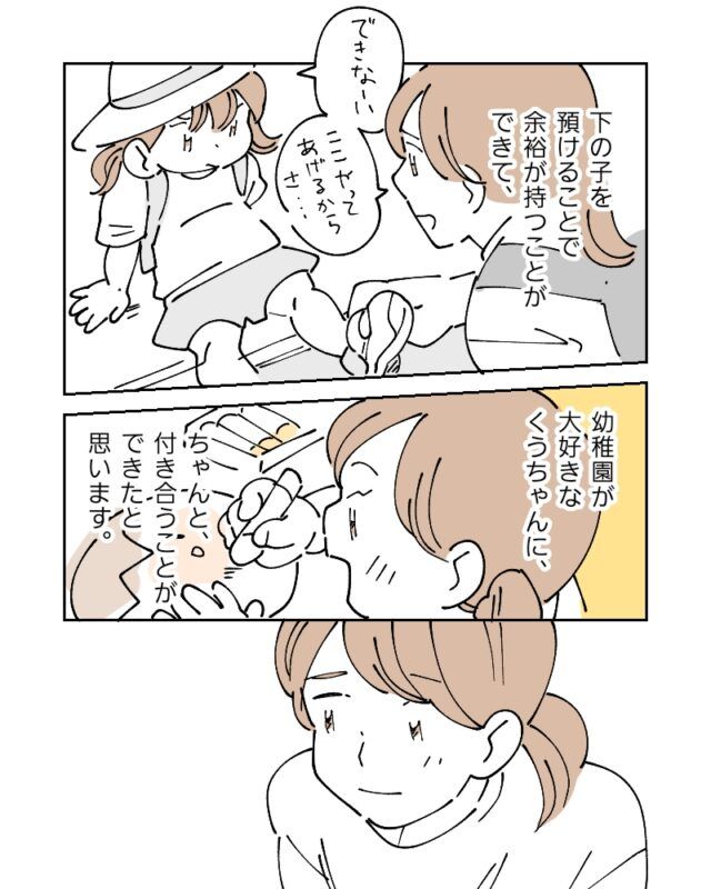 自分のメンタルを保つために、周りを頼ることも意識したマキノさん、一番身近な頼れる大人、ご主人が家にいる時は貴重な1人時間を作ってもらい甘えることに。そして2人を連れて行くことが大変だったプレ幼稚園は、へうくんの動きが激しくなってきたこともあり、がんばるのをやめることに・・