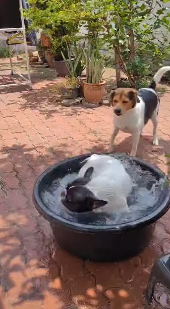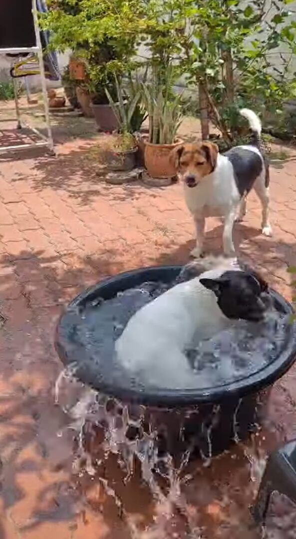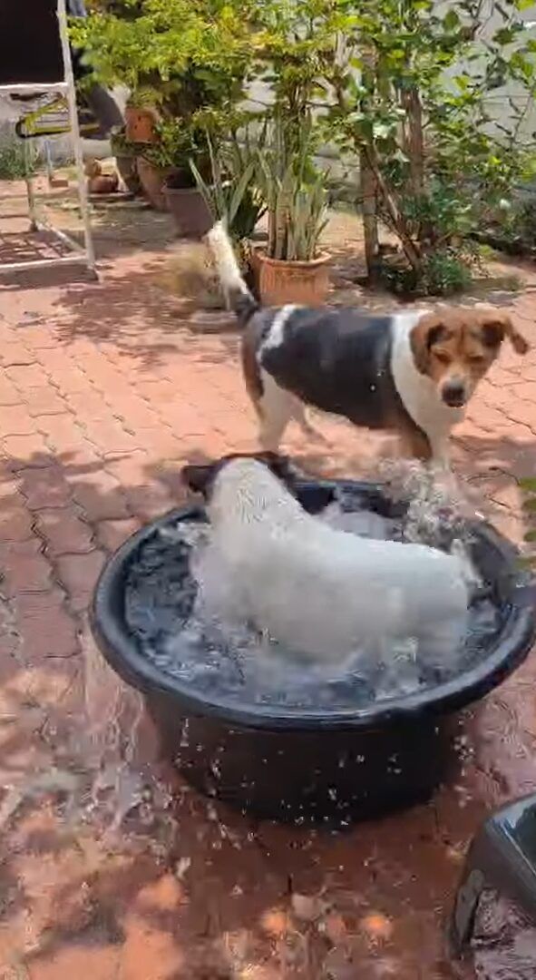 洗濯物を干している場所の近くに置かれたタライという事もあり、それはまるで洗濯機みたいな姿です。 水遊びが楽しくてしかたないようですね!!