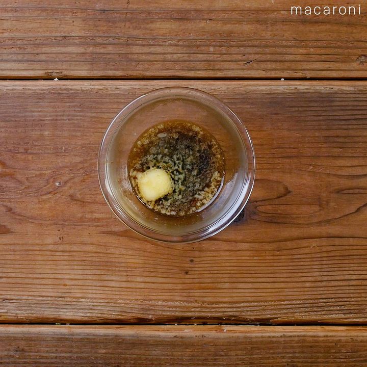 4: 耐熱ボウルにポン酢、バターを入れ、レンジ600Wで30〜40秒します。