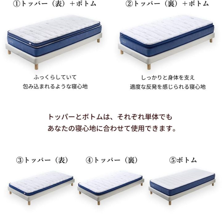 トッパーとボトムの組み合わせ次第で、5パターンの硬さに調整可能。自分にあった硬さを選べます。上の層は柔らかくふんわりとした優しい寝心地。下の層は寝転んでも沈まないかたさで、上を向いて寝ても、横向きで寝ても体にフィット。寝返りもスムーズに行えます!