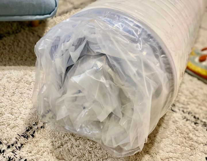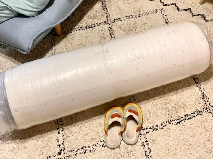 開けてみると、超圧縮されたマットレスがお目見え。袋を切った瞬間、プシュ―という音とともに、圧縮されていたマットレスが解放され、みるみる大きくなっていきます。
