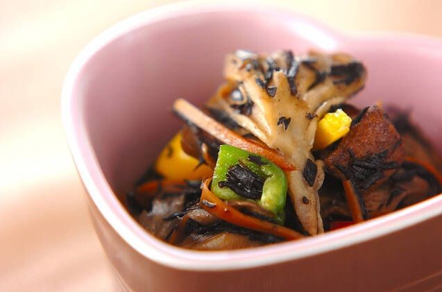 マイタケとヒジキに、ニンジンや赤ピーマン、黄色のパプリカなどカラフルな煮物に仕上げました。お弁当に入れると華やかになりそうです。お好みのキノコでもお試しを!