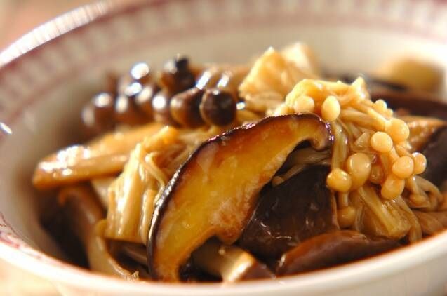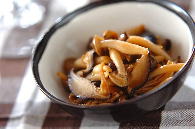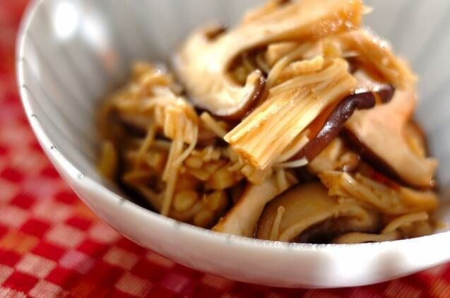 生シイタケ、シメジ、エノキを砂糖やしょうゆ、酒などで煮込んだつくだ煮です。濃いめに味付けをしているので、ご飯と一緒にぜひ。お好みのキノコを使っても。