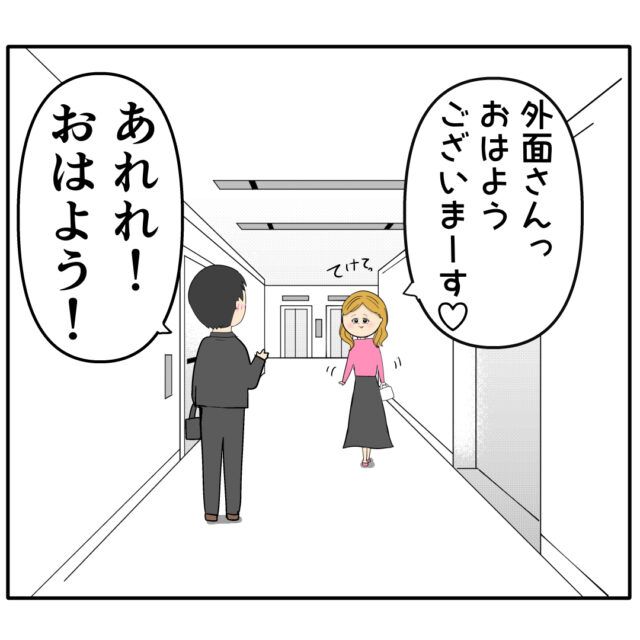 会社の廊下でバッタリ会った良し男さんとふり子さん、