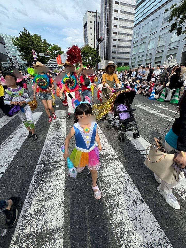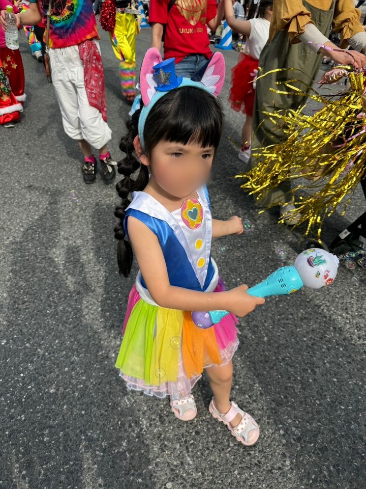 私がパレード隊として参加した、劇団あんみつ姫さんは、今年で40周年で、お祝いのパレードでした。衣装や持ち物の指定がなかったので、とにかくカラフルを意識して、4歳の次女とレインボーカラーの衣装に。私の衣装は全てSHEINです!他の参加者さんもカラフルの方が多く、示し合わせたかのようになりました!