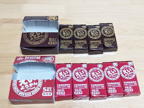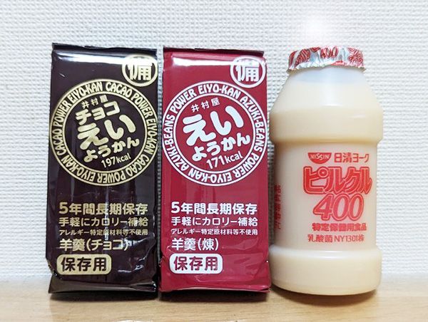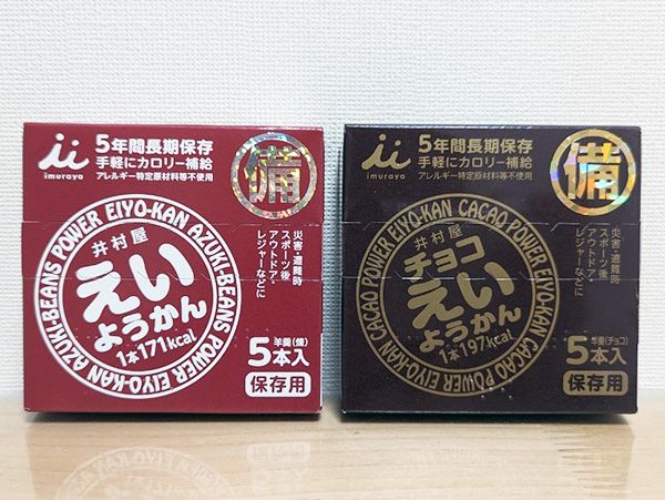 そこで長期保存が可能と話題の、井村屋の『えいようかん』と『ちょこえいようかん』の2種類を試してみました。