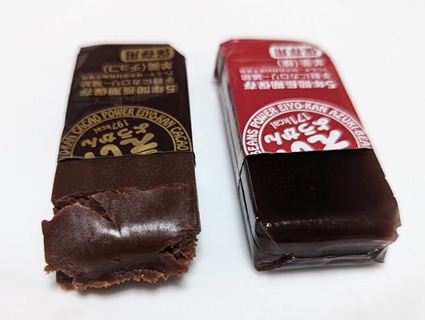 写真だとわかりにくいですが、実際は見た目でえいようかん、チョコえいようかんを判別できます。