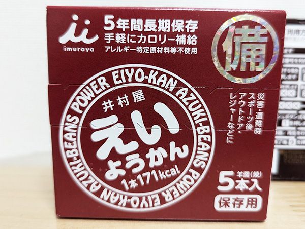 重い、少々割高に感じるなど気になる点もありましたが、それを上回るおいしさと賞味期限の長さが決め手になり、3人家族の我が家は「えいようかん」を5箱、「チョコえいようかん」を3箱備蓄することにしました。