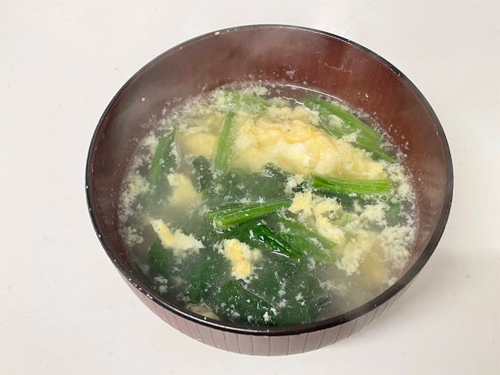 残った汁はもやしの旨味があっておいしいと説明があったので、ほうれん草と溶き卵を入れてスープにしてみました。