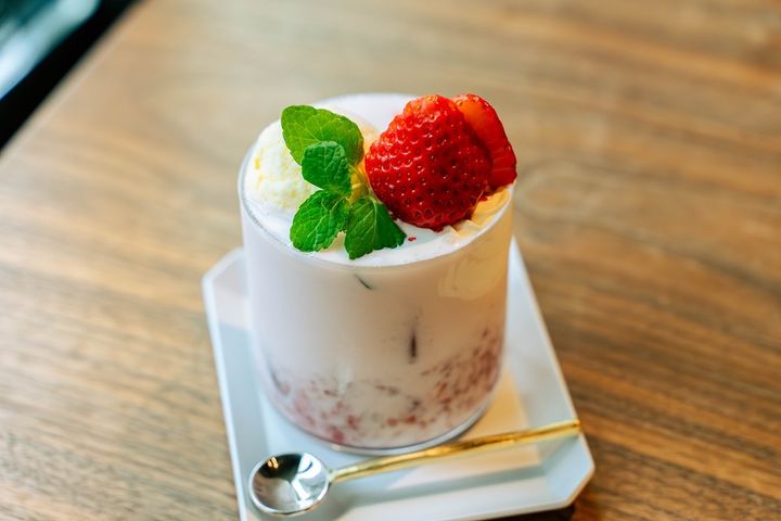 4月いっぱいまで提供されていた「極いちごオレ」890円は、自家製のイチゴコンフィチュールと低温殺菌牛乳で作るスペシャルドリンク。フレッシュなイチゴをはじめ、バニラビーンズ入りのアイスクリームやマスカルポーネクリームをトッピングし、まるでデザートのような満足感です。