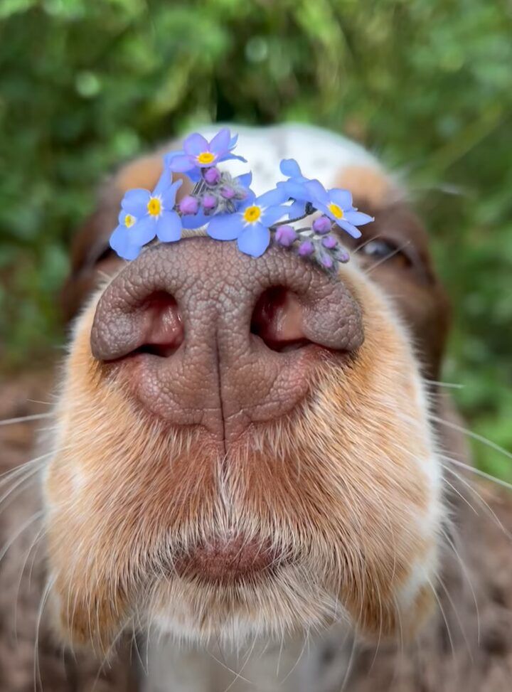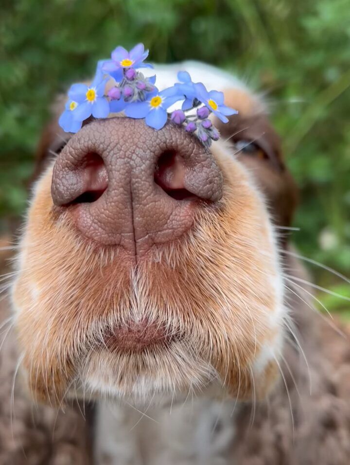 お鼻にお花。勿忘草を鼻に乗せてじっと動かない犬がかわいすぎる!!【海外・動画】